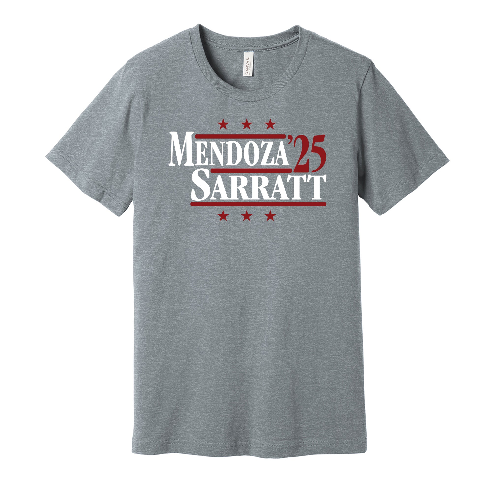 Tired of politicians who don't get anything done? Fernando Mendoza and Elijah Sarratt proved they know what it takes to win in 2025 as they led Indiana to the Rose Bowl victory over Alabama. With Heisman Trophy winner Mendoza leading the offense and Sarratt making clutch catches, this Hoosiers duo dominated their way through an undefeated season and into college football history. From Memorial Stadium to the Rose Bowl, this legendary pair brought glory back to Bloomington. Show your support for your favorite Indiana Hoosiers superstars with this slick, retro t-shirt. You'll be the envy of Bloomington with this political campaign-themed throwback style tee. Will this pair secure the electoral college vote for Indiana? They have my vote, what about yours?